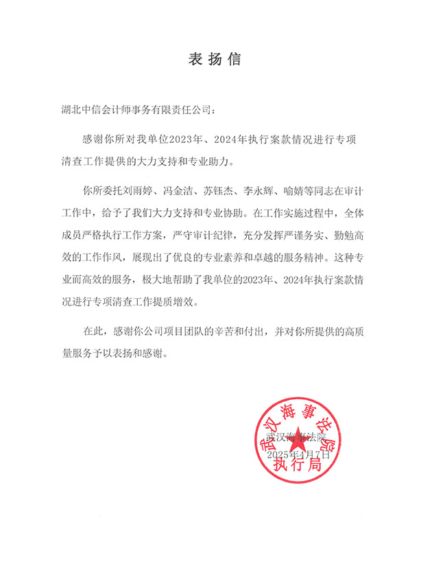 武漢海事法院表揚(yáng)信