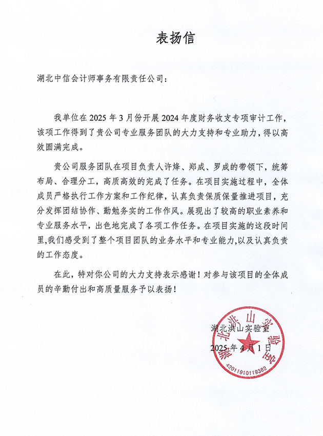 湖北洪山實(shí)驗(yàn)室表揚(yáng)信