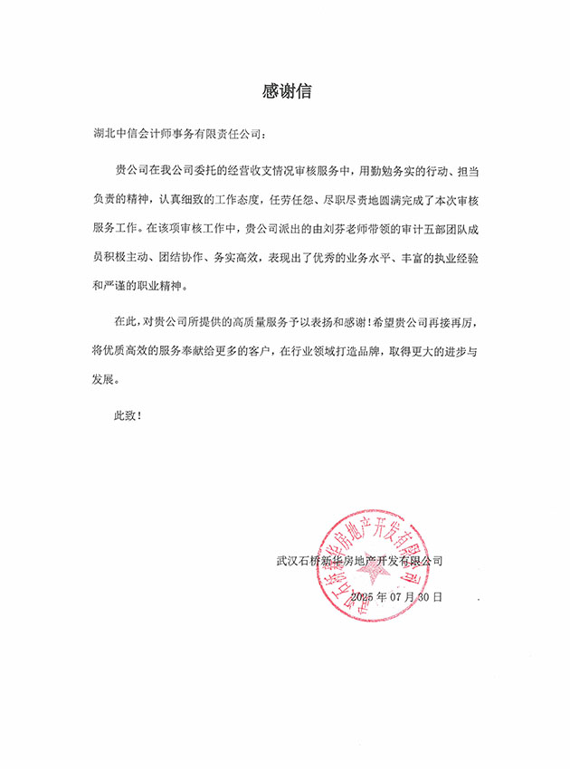 武漢石橋新華房地產(chǎn)開發(fā)有限公司感謝信