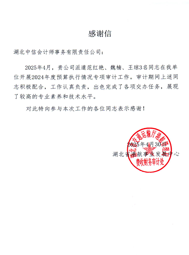 湖北省港航事業(yè)發(fā)展中心感謝信
