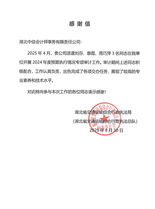 湖北省交通運(yùn)輸綜合行政執(zhí)法局感謝信