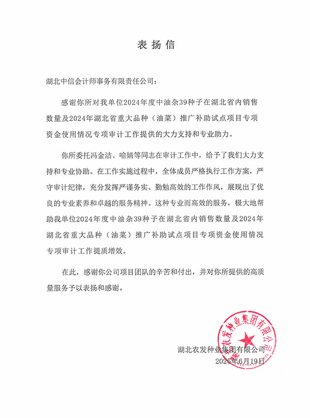 湖北農(nóng)發(fā)種業(yè)集團(tuán)有限公司表?yè)P(yáng)信