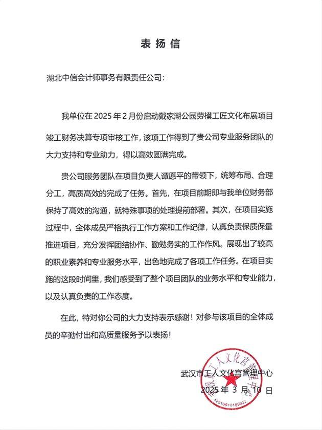 武漢市工人文化宮管理中心表?yè)P(yáng)信