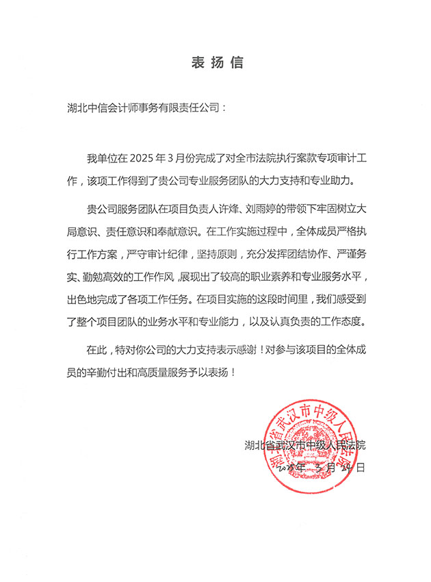 湖北省武漢市中級(jí)人民法院表?yè)P(yáng)信