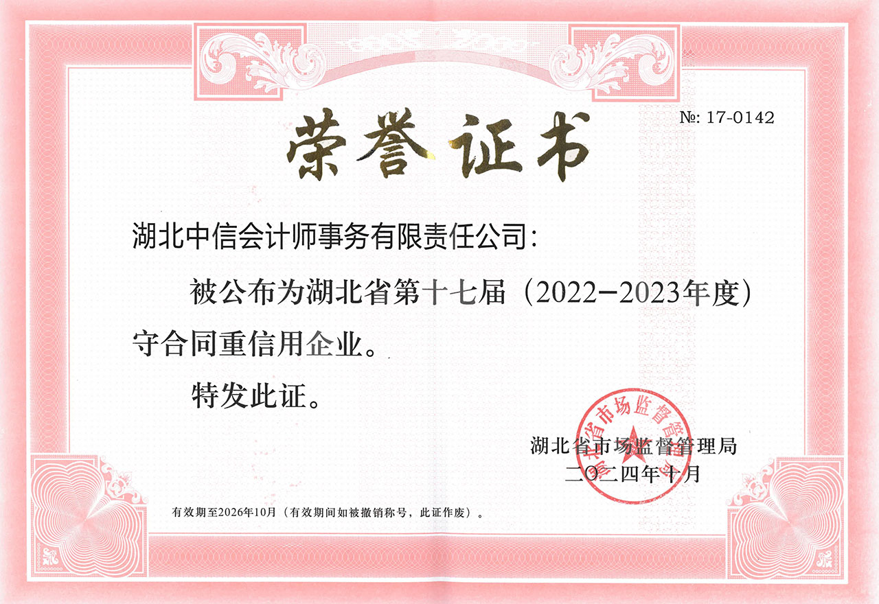 湖北省第十七屆(2022-2023年度)守合同重信用企業(yè)榮譽(yù)證書(shū)